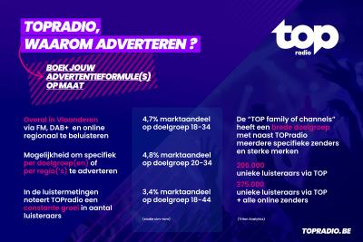 TOPradio is er voor iedereen die jong van geest is. We richten ons primair op de meest interessante doelgroep voor adverteerders: Vlamingen tussen 18-44 jaar. Om deze actieve bevolking te bereiken moet je dus bij TOPradio zijn!